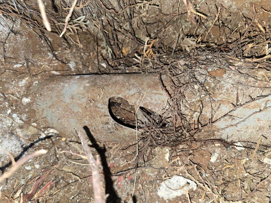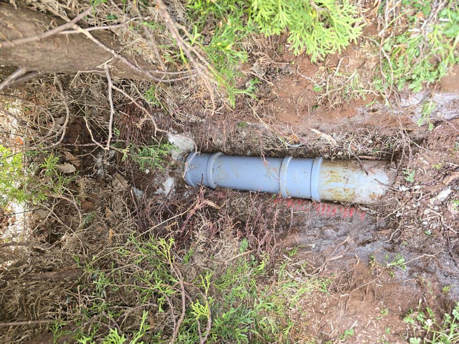 Oštećena cijev odvoda kanalizacije,prekrivena plastika preko i zabetonirano . S vremenom si je korov našao put ušao u cijev i počelo je zaštopavati odvod kao što se vidi na slikama.